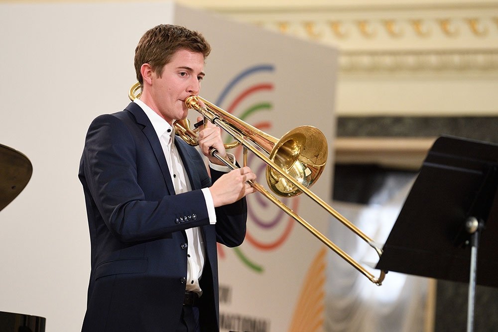 Тромбон (итал. trombone, увеличит. от tromba — труба; франц. trombone, нем. Posaune, англ. trombone) — духовой медный мундштучный музыкальный инструмент. Состоит из дважды изогнутой цилиндрической трубки, раздвижной в средней части, заканчивающейся широким раструбом колоколообразной формы; в верхний её конец вставляется полусферический мундштук. Общая длина трубки ок. 3000 мм, диаметр 15 мм. Изменение высоты звучания достигается посредством выдвижения кулисы. В положении полностью вдвинутой кулисы (1-я позиция) при передувании образуются звуки натурального звукоряда от B1. При выдвижении кулисы натуральный звукоряд перемещается вниз; 7 положений кулисы позволяют получить на Т.-теноре хроматич. звукоряд в диапазоне E- f2 (возможны также осн. тона B1 — А1 — As1 — G1).