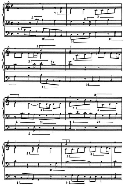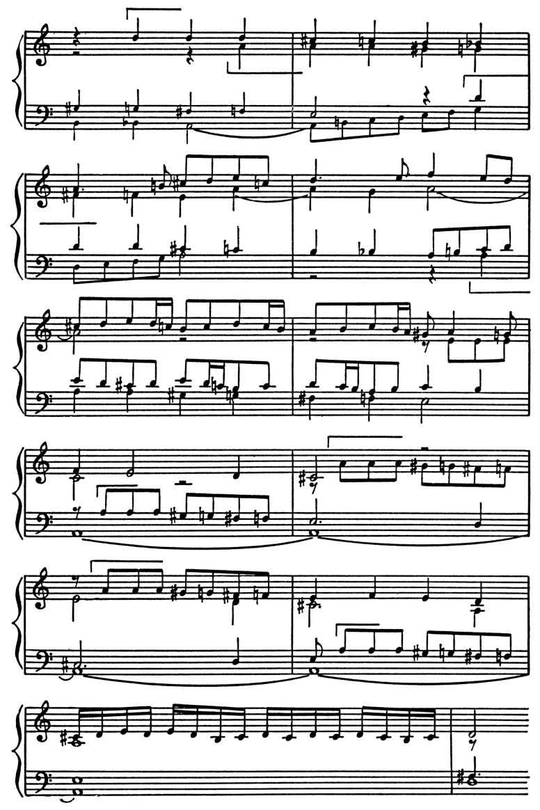 Я. П. Свелинк. «Хроматическая фантазия» (отрывок из заключительного раздела; тема в двух- и четырёхкратном уменьшении).