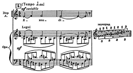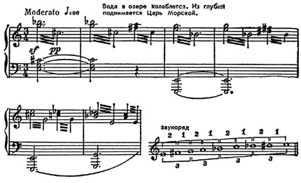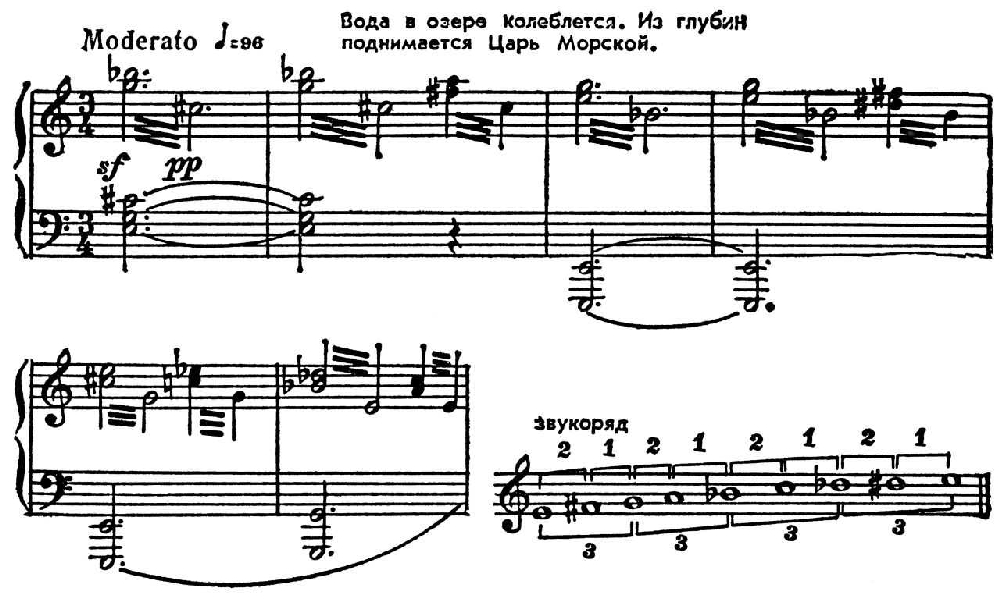 Благодаря структурному сходству малотерцового четырёхзвучия и тритонового двузвучия обнаруживается родство построенных на них ладов — У. л. и тритонового. A. H. Скрябин. 8-я соната для фортепьяно, такты 5–8.