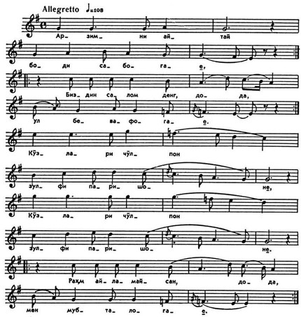 Особое место в У. м. занимают достоны — эпич. сказания, гл. обр. лирико-героич. содержания («Горогли», «Алпомиш», «Кунтугмиш», «Шахсенем и Гариб»). Для песен, входящих в достон, характерны куплетное строение, мелодии небольшого диапазона (развитые формы ашула в достонах практически не применяются). Среди исполнителей достонов (бахши или шаиров) в 20 в. — Фазыл Юльдаш, Эргаш Жуманбулбул, Абдулла-шаир. Ладовая основа узб. нар. музыки — диатоника. Широко применяются ладотональная переменность и модуляции. Почти всегда мелодии кончаются нижним устоем, преобладает поступенное мелодич. движение, скачки внутри мелодич. построения не превышают октавы (обычно восходящие, с последующим заполнением), однако они сравнительно редки. Более широкие скачки встречаются либо в начале, либо между окончанием одной и началом другой фразы. Существ. значение в нар. песнях имеет мелизматика (кочирим — своеобразные форшлаги, группетто; нолиш, молиш, кашиш — разновидности глиссандирования). Особым разнообразием отличается ритмика нар. мелодий. При преобладании размеренного ритма протяжно-напевным мелодиям свойственно обилие синкоп. Встречаются мелодии ярко выраженного импровизац. плана с неупорядоченной метроритмич. основой, т. н. ёввои (неприрученные), наиболее характерные для жанров катта-ашула (большая песня) или паныс-ашула (буквально — песни, исполняемые с подносом). Для этих жанров характерны развёрнутые по форме песни с мелодиями речитативного характера. Исполняются эти песни без инстр. сопровождения, обычно двумя и более певцами. Они относятся к проф. музыке устной традиции.