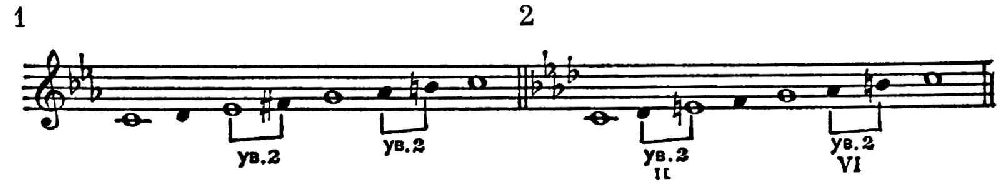 Поэтому второй вид «венгерской гаммы» наз. также доминантовым ладом минора (термин, введённый И. В. Способиным). Оба вида «венгерской гаммы» являются октавными звукорядами, что отличает их от др. ладовых образований с ув. секундами, напр. таких, как лад «Чаргях» в азербайджанской нар. музыке или дважды-двойственный лад в армянской монодич. музыке (состоит из двух слитных тетрахордов с ув. секундой в середине каждого звена, при диапазоне звукоряда, равном малой септиме).