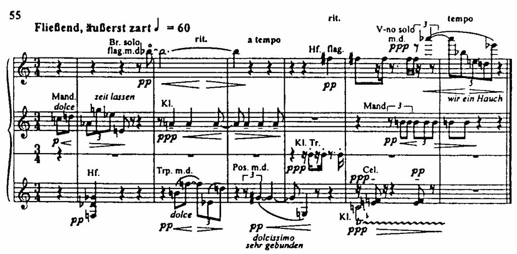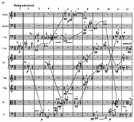 Линии пуантилистической фактуры, сотканные из отдельных звуков и интервалов в простейших ритмических соотношениях (см. пример 57), трудно называть темами, они столь же мало индивидуализированы, как тематические формулы в строгом стиле, индивидуализирован лишь результат их взаимодействия, то есть вся структура. (Примечательно, что в молодые годы Веберн защитил диссертацию о творчестве Хенрика Изака. Впоследствии пристальный интерес к старинной хоровой полифонии несомненно сказался и в его собственном творчестве.)