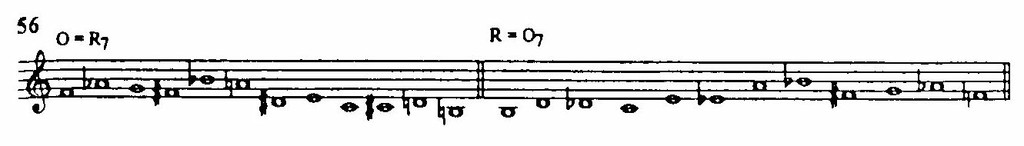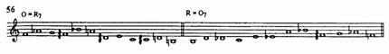 Во-первых, выбираются серии с элементами симметрии в соотношении звуков. Так, серия Симфонии равна своему ракоходу в седьмой транспозиции благодаря тому, что ее вторая половина представляет собой ракоход первой, смещенный на тритон (пример 56). В итоге квадрат из сорока восьми серий реально содержит лишь двадцать четыре разные серии.