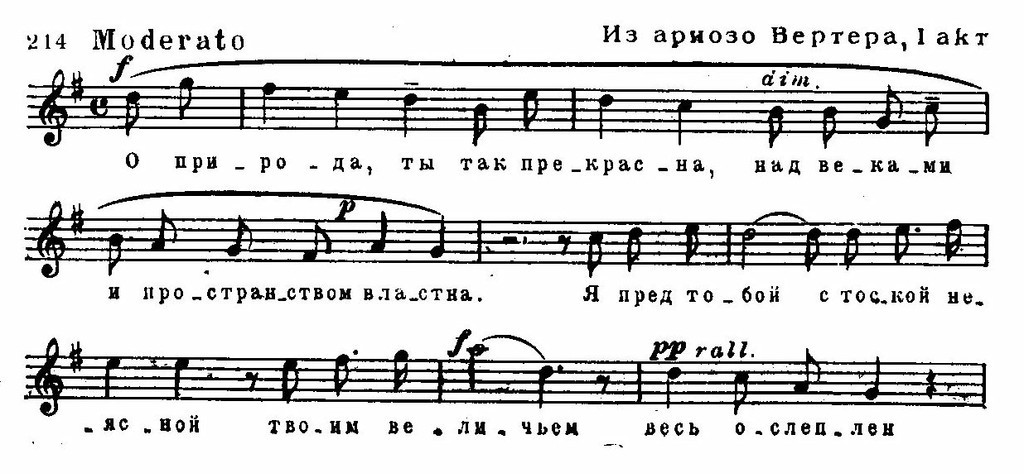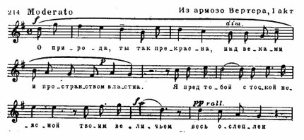 Герой романа Гёте в минуту просветления говорит: «В душе моей царит удивительная ясность, подобная нежному утру весны». Именно эта, нежно-весенняя атмосфера лучше всего передана в опере Массне. И хотя в центре ее стоит Вертер, в музыке незримо главенствует мягкий, женственный облик Шарлотты.
