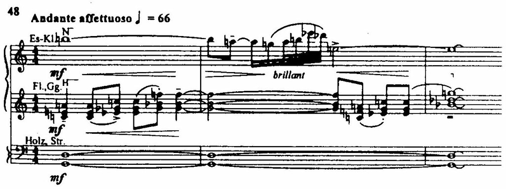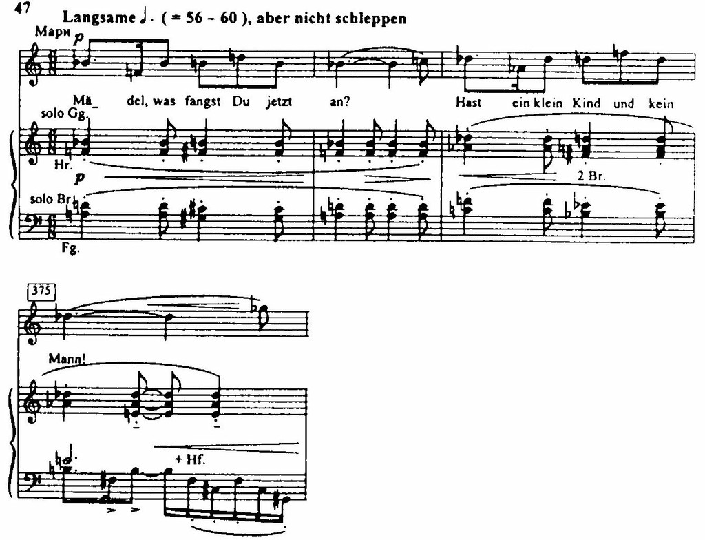 Далее эта тема появляется неоднократно — например, в четвертой картине первого акта (сцена у Доктора) в моменты, когда Воццек обращается мыслями к жене. Трагическая выразительность пониженных ступеней и связанная с этим углубленная минорность ощутимы и во второй сквозной теме героини – сердечной и обаятельной теме колыбельной, рисующей трогательный образ Мари-матери (пример 47). Эта тема еще раз прозвучит, в частности, в момент убийства.