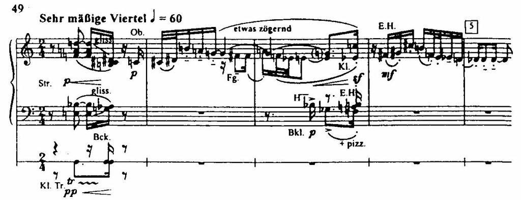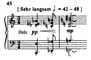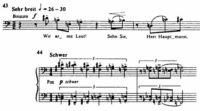 Ряд сцен оперы основан на неповторимых структурных идеях. Такова, например, вторая картина первого акта – рапсодия на три аккорда (см. пример 45), в звуковой ткани которой преимущественно чередуются различные комбинации элементов этих аккордов. Таковы и все пять картин последнего акта: первая (Мари, мучимая угрызениями совести, читает из Библии историю о блуднице, которую простил Христос) – инвенция (вариации) на тему и двойная фуга; вторая (сцена убийства) представляет собой инвенцию на один звук (h), подобно навязчивой идее непрерывно звучащий в течение всей сцены, а в конце ее мощным наплывом захватывающий весь оркестр, который объединяется в громогласном унисоне; третья картина (Воццек в кабаке пытается гульбой заглушить ужас происшедшего) инвенция на выдержанную ритмическую формулу