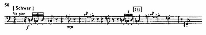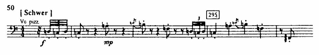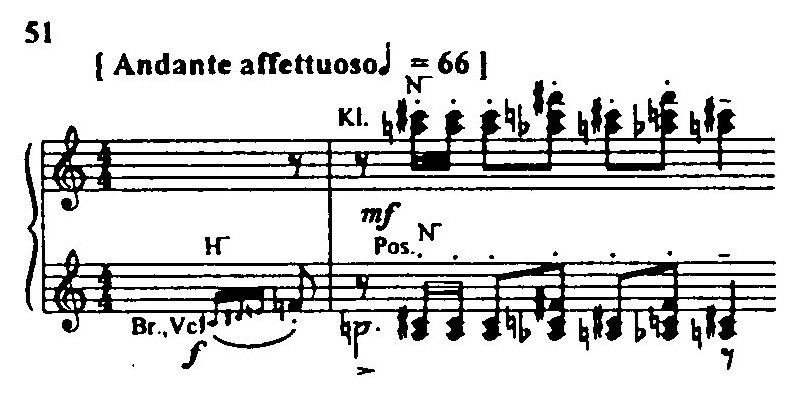 Большое значение приобретает и вторая тема Воццека, характерная угрюмой и к тому же «спотыкающейся» на последних звуках нисходящей поступенностью (пример 44). Она появляется во второй картине второго акта, где Воццек из разговора с Капитаном и Доктором узнает сообщаемую ему с нарочитой светской непринужденностью новость, которая для него страшнее смерти, – о неверности его горячо любимой Мари.