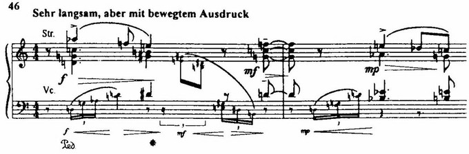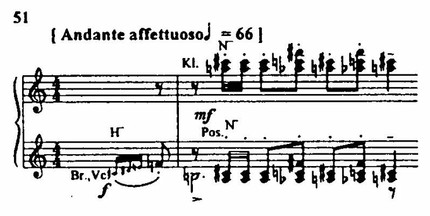 Одним из важных лейттематических элементов, связанных с интонационной сферой Воццека, становятся «аккорды ужаса» (пример 45) – три аккорда, составляющие тематическую основу второй картины первого акта, в которой Воццек вдали от города вместе с приятелем, солдатом Андресом, срезает ветки кустарника и под воздействием тяжелого нервного состояния принимает закат солнца за кровавое зарево.